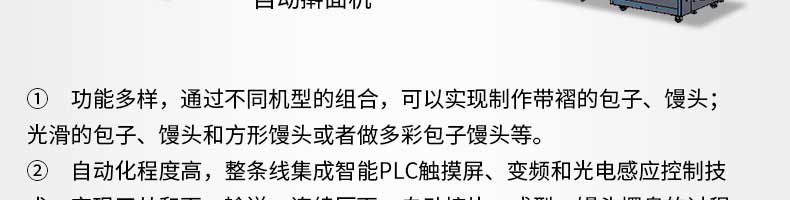 智能包子饅頭生產(chǎn)線,功能多樣,通過(guò)不同機(jī)型的組合,可以實(shí)現(xiàn)制作帶褶的包子、饅頭;光滑的包子、饅頭和方形饅頭或者做多彩包子饅頭等