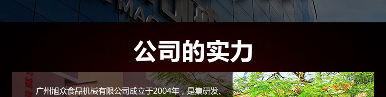 廣州旭眾食品機械有限公司是一家集科研開發,生產設計,營銷服務為一體的現代化生產企業?,F代化生產車間,精湛制造技術,所產機械歷經市場重重考驗,不斷贏得海內外客戶的贊譽。
