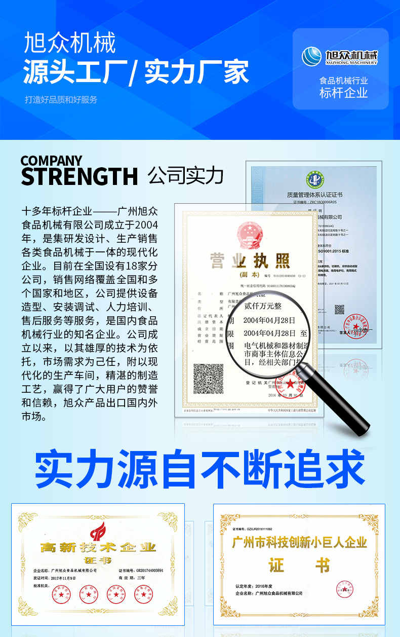 廣州旭眾食品機械有限公司是一家集科研開發,生產設計,營銷服務為一體的現代化生產企業。現代化生產車間,精湛制造技術,所產機械歷經市場重重考驗,不斷贏得海內外客戶的贊譽。