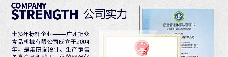廣州旭眾食品機械有限公司是一家集科研開發(fā),生產設計,營銷服務為一體的現(xiàn)代化生產企業(yè)。現(xiàn)代化生產車間,精湛制造技術,所產機械歷經市場重重考驗,不斷贏得海內外客戶的贊譽。