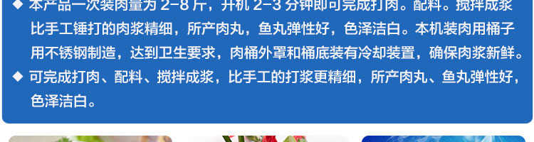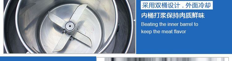 SZ-18型肉丸打漿機(jī),本機(jī)裝肉用桶子采用不銹鋼制造,達(dá)到衛(wèi)生要求,肉桶外罩和桶底裝有冷卻裝置,確保肉漿新鮮。比手工的打漿更精細(xì),所產(chǎn)肉丸、魚丸彈性好,色澤潔白。
